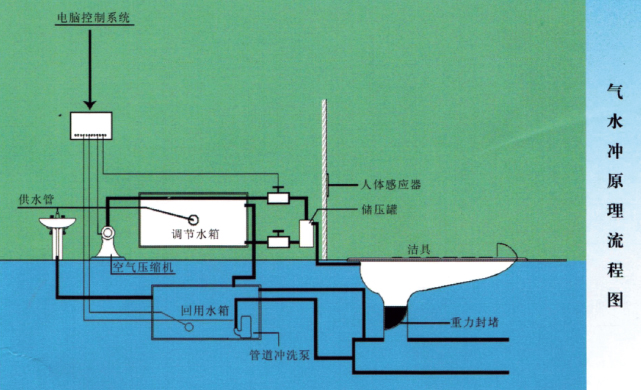 氣水沖廁所有壓縮空氣與水混合釋放高壓氣水通過便器上的特殊噴嘴沖洗糞便,小便沖洗一次用水200ml大便2次用水400ml,便器采用直落磁力密封廁具,干凈無臭味。