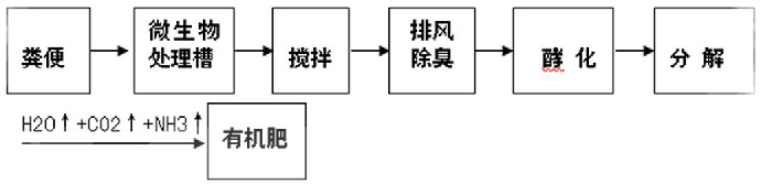 利用微生物降解有機物的原理,把附有微生物菌種的木屑放在廁所下方的處理槽 內,對大便通過攪拌→排風除臭→酵化分解→加熱蒸發等步驟將排泄物進行處理 將其轉化成二氧化碳,水蒸氣和少量氨氣排放到空氣中,剩下的固體成分較少在 半年或一年左右清理一次,清理出來的肥料可直接用于種植無公害蔬菜和花草 樹木。示意圖如下: